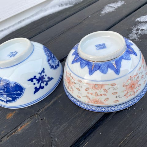 Tre pent brukte boller med rosemønster. Tre størrelser: 15 cm, 17,5 cm og 20 cm i diameter. Gullkant både øverst og nederst på bollene. Litt slitasje i gullfargen langs øverste kant, men ingen hakk eller riper. Er aldri vasket i oppvaskmaskin. Usikker på når de er produsert, men søk på nett gjør at jeg har funnet frem til mulig 60-tall. Er ingen ekspert, så kan ta feil. Merket med "Made in Liling China" under. Prisen er for alle tre.