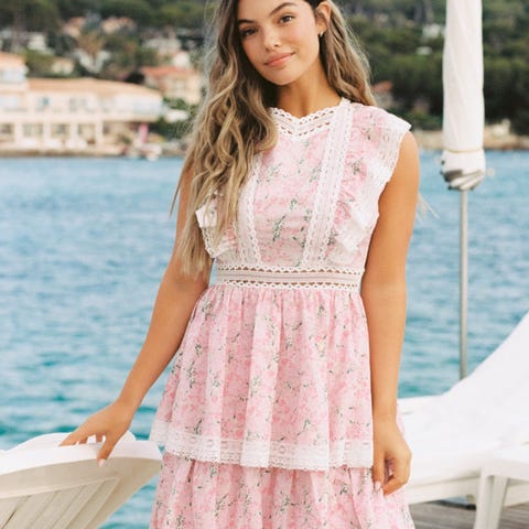 Nydelig kjole fra Love Lolita, hvit med blått/lavendel blomstermønster. Brukt 1 gang (nyvasket). Str L (ikke stor i størrelsen).