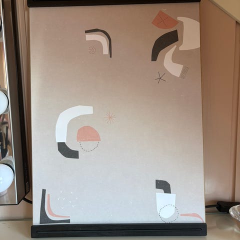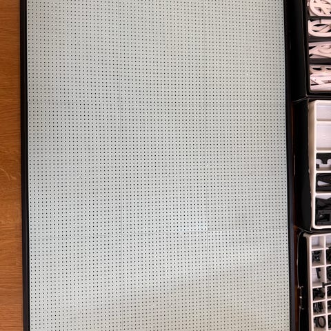 Pent brukt rosa bokstavtavle og eske med bokstaver