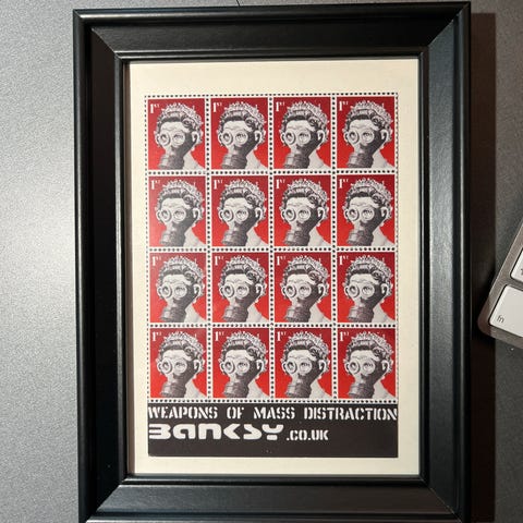 Innrammet trykk av Bergens kunstneren Per Louar fra 1982, innrammet av kunstneren selv. Uoffisielt ble dette verket kalt "Kennedys tre enker", Jackie, Marilyn Monroe og hans mor Rose.