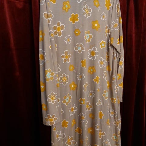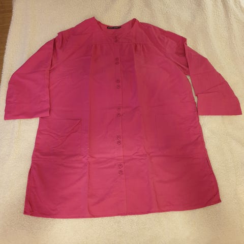 Kjolen er svart med ulike detaljer. Str 54/56, Stormote. Den har 1 sidelomme, høy krage med snøring, lange ermer med ribbekant mansjett. Veldig myk og god, meget behagelig stoff. Den er ubetydelig brukt, da den er litt for lang til meg. Hel lengde ca 113 cm.