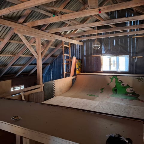 Medfølger eget bord / stativ som selve parken står montert på. Kryssfiner har vært reparert i quarterpipe. Må hentes.