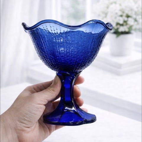 Retro glasskål i fin blåfarge. Skålen kan benyttes til en rekke formål. Den egner seg ypperlig til servering av små snacks som godteri eller nøtter. Skålen fungerer også utmerket som en holder for ringer og smykker. Den har en liten avskalling (se bilde nr. 5). Dette er lite synlig. Se bilder for detaljerte mål. 💙