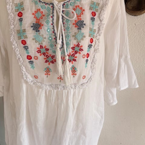 Ny kjole, aldri vært brukt! - kun hengt i skapet og selges nå da jeg har for mange kjoler. - hvit med svarte prikker blonde nederst på armene .- står str.38 men kan også passe en 40 og liten 42. Da den kan strammes etter ønske i livet.- veldig søt kjole og en god passform. Sender gjerne men kjøper må betale porto