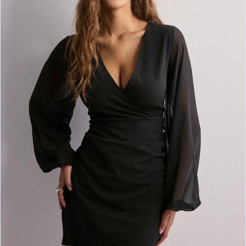 Som ny, lite brukt, Francesca's collection Tate metallic godet mini dress i farge svart med søl tråd i stoffet. Størrelse M. Den er kjempe fin på og gir flirty vibes med gjennomsiktig stoff på skuldrene og ryggen. Ellers er kjole ikke gjennomsiktig 😊 Perfekt for date night eller som selskapskjole. Kjøpt i USA for $50 for noe år siden.