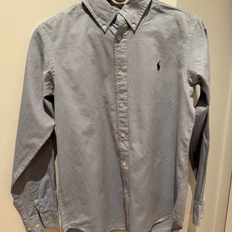 Polo-skjorte i smårutete blått/sort stoff i str. 14-16 år. Meget pent brukt. Selges kr. 400.-