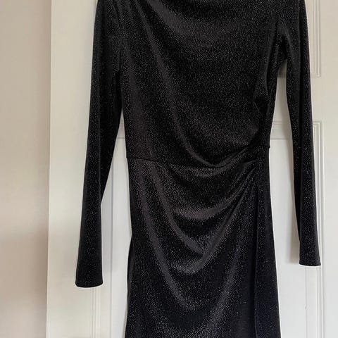 Saten svart kjole med spilt overknee og åpen rygg med stropper.