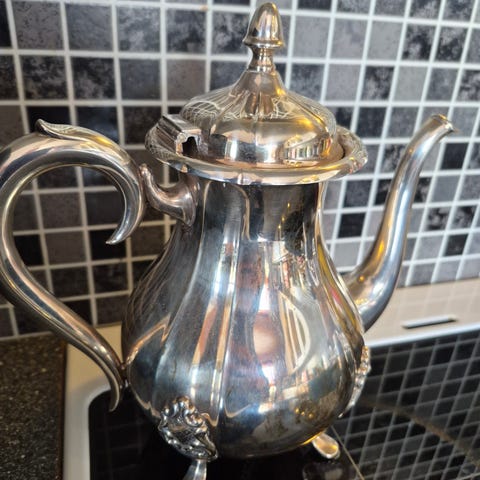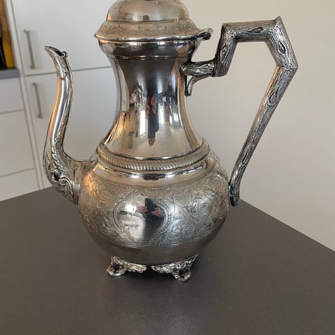 Selger en flott, eldre kaffekanne i engelsk sølvplett (Electro Plated Britannia Metal – E.P.B.M.).