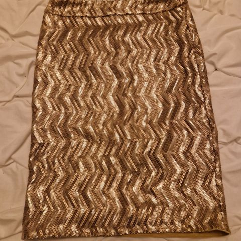 Lekkert gullskjørt med broderier i gull. Aldri brukt. Vanvittig bra kvalitetsstoff. Ble for kort, ville legge det ned og tok opp sømmen, men kom ikke lenger. Så selger det til noen som er kortere enn meg, 175, eller vil ha kort skjørt.