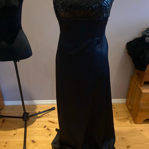 Svart ettersittende aftenkjole i størrelse 42, med dyp utrigning og et lite slep (prøvde ta bilde 2), noe åpen rygg - brukt en gang