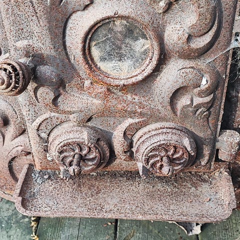 Strøken peis. Emaljert støpejern, grønn med kobber.
