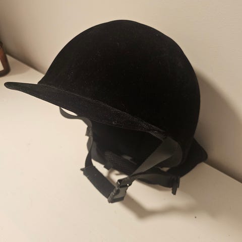 Selger sort ridehjelm I str. 58. Må hentes hos selger.
