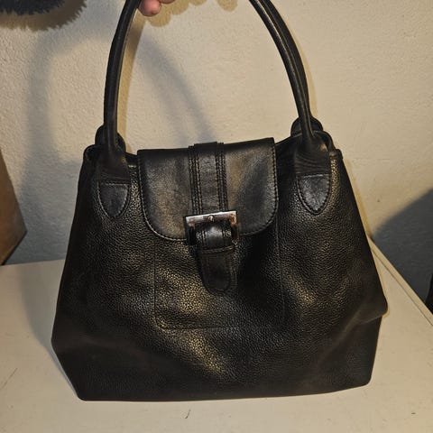 Den klassiske elegante veske laget av ekte skinn, kan brukes som skulderveske og ryggsekk, flere lommer, kjøpt i Oslo.