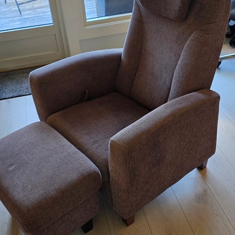 Lenestolene er svingbare. Og de har tilhørende fotlener. Litt bruksslitasje.