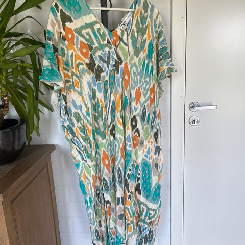 Lang sommerkjole fra Inc som er ypperlig å ha med på reise da den ikke krøller og er lett. Kjolen er myk i stoffet, med stretch så passer de fleste fasonger, blå i bunnfargen og mønster i fresche rosatoner, oransje og hvitt. Søt som strandkjole eller med flate sandaler til fest. Liten knapp i nakken, høyt liv som gir en flatterende look og fin skjæring i hals/skuldre. Kjolen når ca et par cm over ankelen på meg som er 171 cm.
