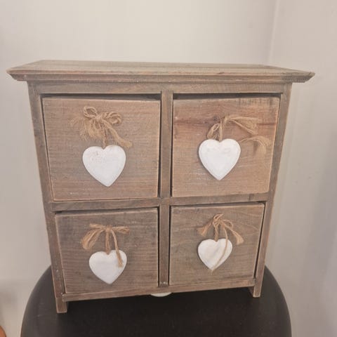 Veldig pent, romantisk og unik hjertekommode / skap i hvitbeiset tre og rosa blomster, til å oppbevare smykker / sminker/ parfymer osv.....