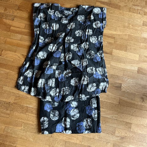 Håndsydd kjole fra Tanzania i batikkmønster i oransje, rød og brun, med brunt liv. Kjøpt i Tanzania, Afrika