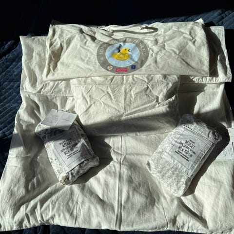 Sengetøyspakke med dyne, pute, laken og fleeceteppe til jente.