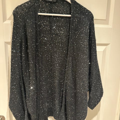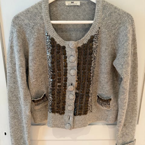 Beige/brun cardigan, str M. Med paljetter i stolpen.
