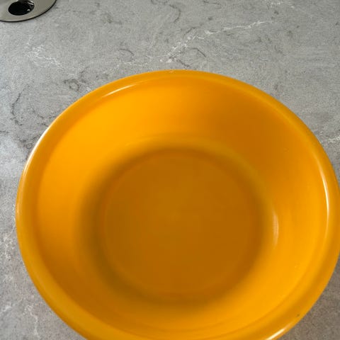 Unik emaljebolle 21 cm selges. Den har en hvit utside og en knall oransje innside.