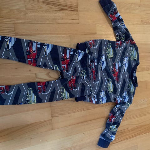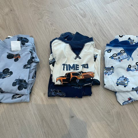 Pysjamas sett med bukse og genser Strl 86/92 med monster truck motiv selges for kroner 40.