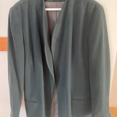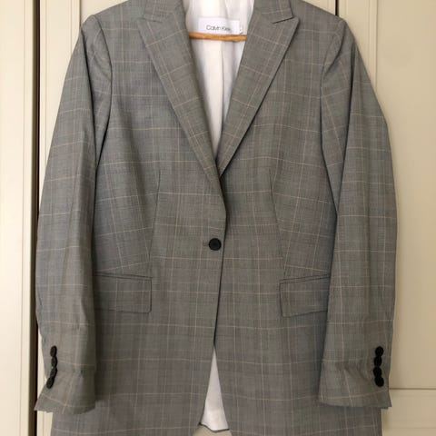 Klassisk kort pin-striped blazer i grått fra Calvin Klein. Nydelig kvalitet i tynn ull. Som ny, veldig pent brukt få ganger. Amerikansk str 2. Passer en norsk small str 34-36.