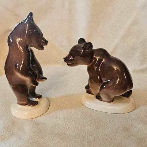 To sjarmerende bjørner, selve symbolet på Russland. Laget av Lomonosov under den kommunistiske perioden, stemplet USSR, som for mange gir de et ekstra samlerpreg.
