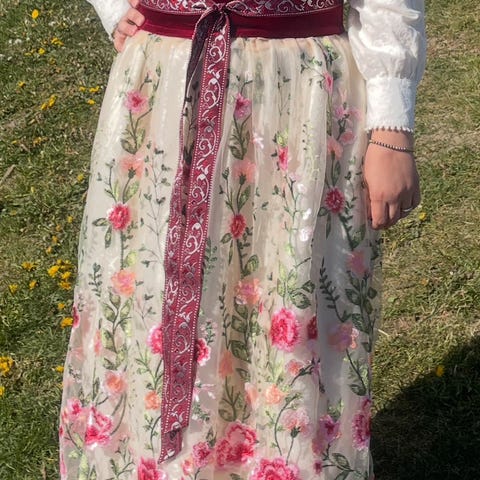 En vakker festdrakt selges🌸. Ca str 38, skjorten er en kjole som kan brukes når det er for varmt til festdrakten, og sydd av bomull fra 70 tallet, og stakken er sydd i overskuddsull fra krivi vesten er ull og håndbrodert på ryggen. Veldig fin passform. Stram i livet men er over magenivå, så fasongen blir litt puff, og skjorten fungerer fint som et underskjørt.