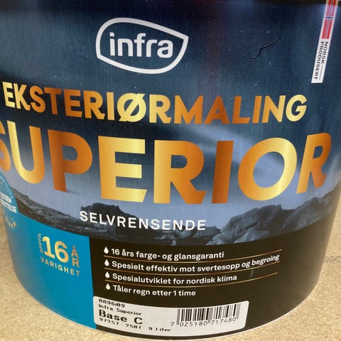 2 stk spann med 9 liter med maling til hus selges. Farge klassisk hvit.