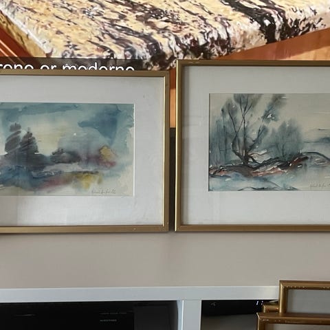 Pene akvareller med ramme og glass fra Rammeverksted selges kr 250 pr bilde.