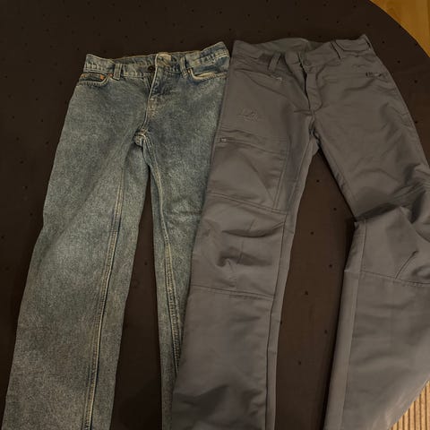 4 jeans, 1 velourbukse, 2 bluser, 6 bomullstopper, 4 college gensere (1 med glidelås og hette som hører sammen med velourbuksen) og 3 shortser.