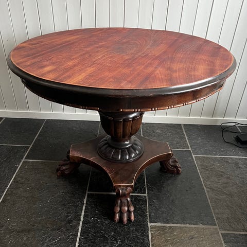 Fantastisk flott rundt antikt bord med løveføtter og bordplate i rot finer selges