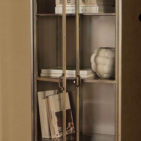 Et nydelig skap i tre (mangotre med mahognyfinish), metall og rotting. Skapet har faste hyller.
