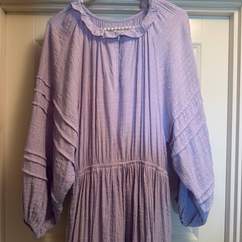 Brukt noen få ganger. Jersey stoff, så myk og god å ha på. Ingen skader. Lommer i sidene. Kjolen kan danderes i brystparti på mange måter, da snorer kan knytes og varieres. Smaleste parti liv passer 70 - 95cm pga strikk i liv. Lengde ca 140 cm, avhengig av hvor stramt man har snor rundt hals. Kostet ny ca 2000.-