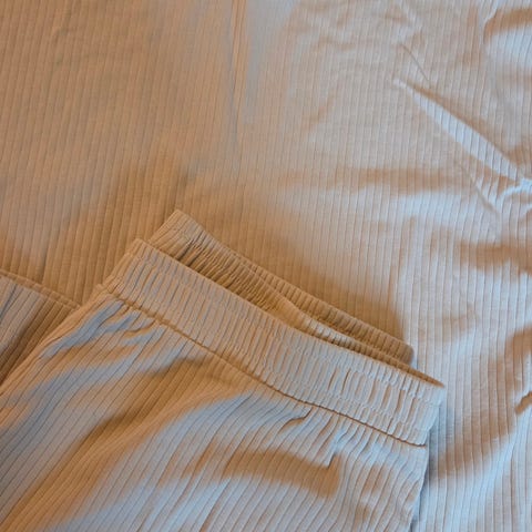 Topp med halvhøy hals og vid bukse med lommer. Lett stoff med stripestruktur. Lys grønn/mint farge. Velour i stripene. Lett og ledig sett til reise
