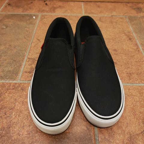 Sko fra merket DC. Skoene ser fine ut. Merket på innsiden av skoen er slitt. Det er også et merke på toppen av høyre sko.