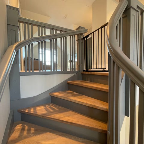 Solid og fin trapp. Svinner til venstre. 11 trinn, ca. 2.0 m. Lang, 80 cm Bred, 2.60 m.Høyt.