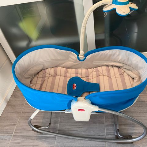 Tiny Loves 3-in-1 Rocker Napper er en kombinert vippestol og vugge. Beroligende bevegelser vugger barnet ditt, mens vippestolens høye kanter gir et trygt og koselig miljø. Det søte leketøyet spiller musikk og hjelper barnet ditt med å utvikle gripeevnen.