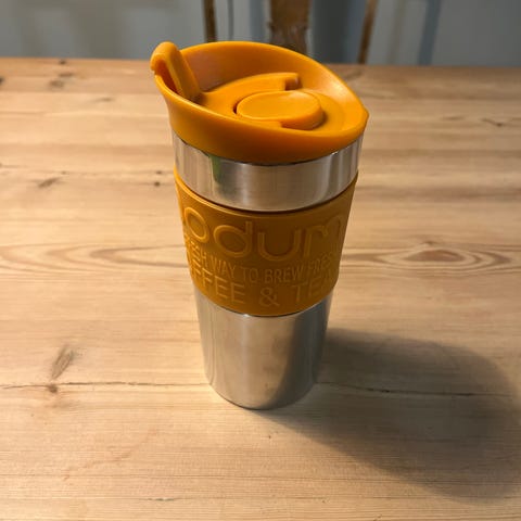 - Bodum gjennomsiktig kaffekopp (litt lik denne: https://www.bodum.com/no/en/11103-01s-travel-mug).