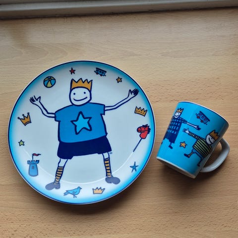 Asjett, krus og dyp tallerken. Ingen synlige merker eller hakk, kan derfor fint gis som gave. Brukte det knapt, da det var en ekstraseng hos besteforeldre.