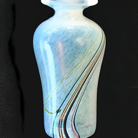 Nydelig vase i Rainbow-serien designet og inngravert med signatur B. Vallien. Framstår i meget pen stand, men med et ørlite nagg, nesten usynlig, på kanten (se bilde). Dette gjør at jeg har prist denne veldig lavt. Høyde ca. 14,5 cm. Pris kr. 125,-.