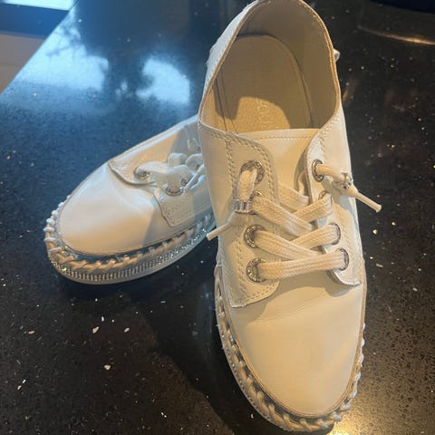 Kjøpte et par skinnsko i København for noen år siden, siden med min bare vilje ikke kunne gå fra det. Men ryggen min er overhode ikke enig med meg. Så etter flere år i skapet, må jeg selge det videre til noen faktisk kan gå med det, og elsker det like mye som meg! Skoene er i mykt skinn, høy hel, men det er ikke så bratt. Det er i rødt, grått og sort skinn, har snøring, og er istørrelse 38. Skoene er lite brukt, men noen brukerspor er det, men da må man se etter. Hbo. Kr 200. PS: sender ikke med posten da jeg uansett får straffegebyr på alt jeg sender uansett hvor innafor det er. Kan sende med post nord til 69 kr.