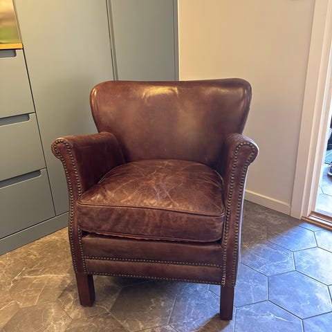 Skinn ørelappstol selges. Ligner Artwood, men er fra annen produsent. Nydelig patina, feilfri med unntak av 1 manglende knapp i rygg og meget godt behandlet. Den ble dessverre litt for stor i min nye bolig og søker nå nytt hjem hos snille mennesker med sans for kvalitet. Den har nydelig sittekomfort og er i sjelden gul farge. Kan være behjelpelig med levering på aksen Folldal - Ski.