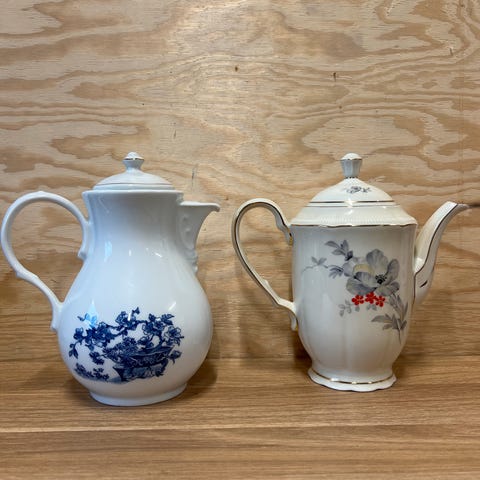 Kaffekanne, liten blomstervase, fløtemugge, sukkerkopp uten lokk -