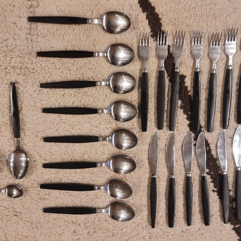 Gammelt bestikk med solid plast håndtak.
