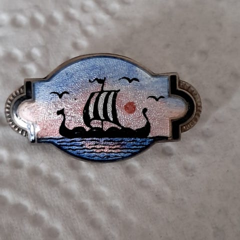 Sølv emalje brosje med vikingskip