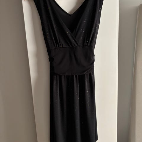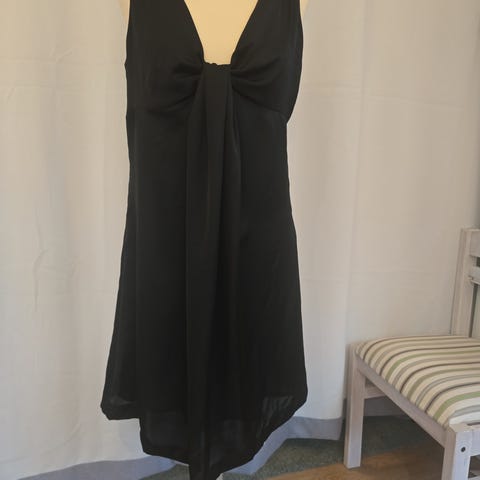 Svart maxikjole fra Passage i ca. Str. L, med «knute» i utringningen. Kjolen er ca. 144 cm lang målt fra skulder og ned.