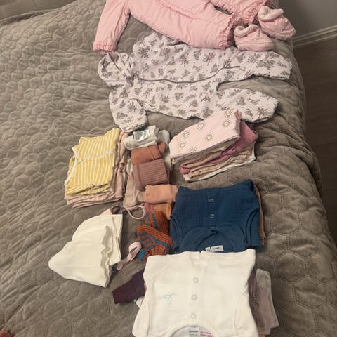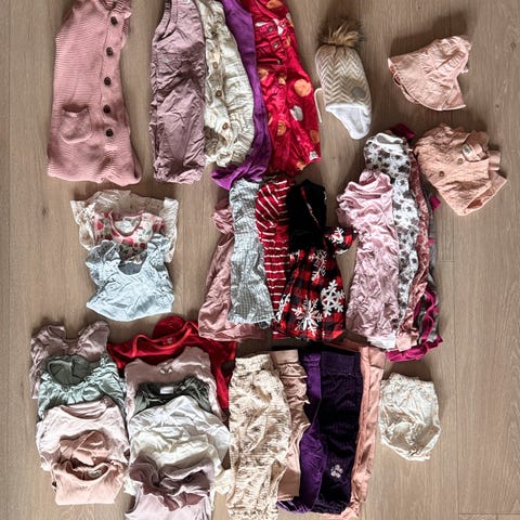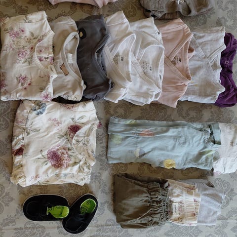 Kjempefin klespakke til jente med vår-/sommerklær, str 68, pent brukt. Inneholder bodyer (bambus og bomull), UV drakt, jump suit, solhatt og caps, badeshort, to par sokker (bomull), en kortermet body, myke bukser (bomull og bambus), tight med tynnskjørt, tre myke pysjer og en fin drakt med lange ermer
