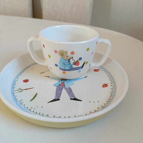 Pent brukt barnetallerkener. Tykke, lette tallerkener. Brukt til å ha skiver og snacks. Kan vaskes i oppvaskemaskin.