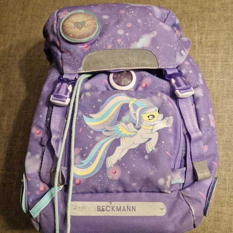 Perfekt sekk til 1-klassingen! Pent brukt, men en glidelås på siden er ødelagt/falt av.